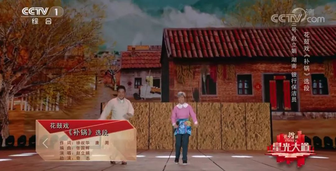 随后,赵立娟搭档著名相声演员奇志老师表演了一段湖南花鼓戏“补锅”,曲调活泼、旋律流畅、表演朴实明快,节目组更是为她主动邀请评委奇志老师,请老师教学纠错并精心筹划节目。